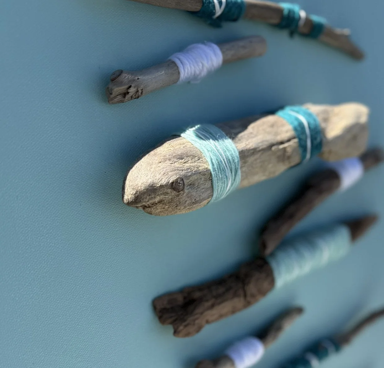 Fiber art and driftwood compositions sourced directly from Lake Michigan.